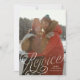 Ett religiösa-jullott bildkort med "Rejoice"-text överlagrad i en vintage, lyxiga skripttypsnitt ovanpå fotot. Kortets baksida har plats för ett längre meddelande.