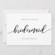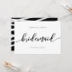 Stilfull "Vill du vara min brudtärna"-kort med orden "Brudtärna" i ett avslappnat kursivt skrivsätt i svart mot en vit bakgrund. Kortet har en svart baksida med överlappande vita linjer.