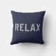 Kastkudde med "Relax"-bokstäver i modern vit urban font på mörkblå bakgrund.