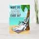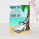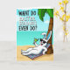 This card features a white-furred rabbit lounging at the base of a leafy palm tree 🐰. The bunny’s long ears show a soft blue inner tint, and dark sunglasses sit above a wide grin that suggests it’s sharing a private joke with someone just off to the side. In the background, an aquamarine ocean stretches toward the horizon, meeting a warm golden beach under bright, even cartoon-style lighting. A striped towel in pink and blue lies beneath the relaxed figure, adding a cozy, vacation feel that reads like an easy day with a close friend. One paw holds a bright green drink with a straw, as if it’s been offered in a small, affectionate toast 🐇. Across the upper half, a large all-caps question is printed in dark lettering, centered and spaced wide against the sky for easy reading. The palm fronds arc overhead in rich greens, and the shoreline curves gently behind the reclining bunny.
