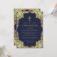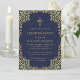 Denna eleganta bekräftelseinbjudan i marinblått och guld med vintagekaraktär, rekommenderas för en pojke, har en utsmyckad ram i falskt guld med gyllene blad på en marinblå bakgrund. Ovanför texten finns ett religiöst kors i falskt guld. All text kan anpassas och har en gyllengul färg liknande den falska guldramen.