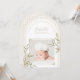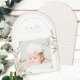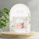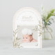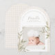 Fira ankomsten av er lilla välsignelse med detta eleganta och tro-inspirerade födelsekort. Med en mjuk neutral rutig bakgrund, en delikat valvformad ram och er babys dyrbara foto, är denna tidlösa design perfekt för att dela er glada nyhet med nära och kära.