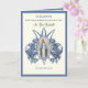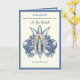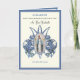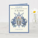 Med en vacker specialdesignad katolsk examenshälsning med den saliga jungfru Maria, Vår Nådens Fru, överlagd på ett marian "M" med blå blommor.