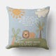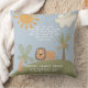 En söt kristen daghemskudde med ett djungeltema illustrerade scenen med ett lejont, handflatan träd, sol och moln. Den bibelversen från Luke 2:40 är redigerbar. Anpassa med barns namn- och födelsestatistik i vitt. Gör en underbar nyfödd gåva.