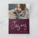 Religiösans julfotkort har ett modernt, vitt penselskript på en vacker mörk med mulberry bakgrund.