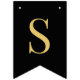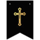 A black and gold bunting flags banner fit for religious celebrations like baptisms, first communion or religious confirmations of boys. Golden caps on black background, with 2 faux gold crosses between the words. The message is "God Bless" followed by a 6 letters name (the default is Joshua).