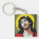 Classic religious portraiture meets vintage comic book aesthetics in this striking graphic interpretation. The design features a central figure with a crown of thorns and a radiant yellow halo, rendered with bold black outlines and a vibrant primary color palette of red, blue, and yellow. Distinctive Ben-Day dots provide texture and depth to the skin tones and background, capturing a retro halftone print effect. A heavy black border frames the composition, completing the pop art panel appearance.