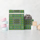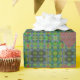 Färga hjärtformer ordnas i ett repetitivt mönster mot en vibrerande, symmetrisk bakgrund fylld med intrikad grönt och blå design. Designen skapar en kaleidoskopisk effekt som ger en visuell upplevelse som blandar ordning och komplexitet.