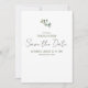 Modern och minimalistisk platt rädda datum-kort. Framsidan är ren och minimalistisk med anpassningsbar text och en enda Eukalyptus Watercolor-gren. Baksidan är i solid salvia.