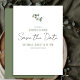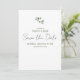 Modern och minimalistisk "Save the Date"-kort med platt design. Framsidan är ren och minimalistisk med anpassningsbar text och en ensam eukalyptus-kvist målad i akvarell. Baksidan är i enfärgat salvia.