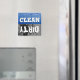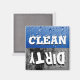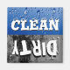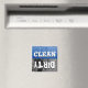 Kökstornet Clean and Dirty dischher med blå mousserande bubblor med ord "CLEAN" i vit text på ena halvan och en grungande bakgrund med ord "Dirty" i stort, lätt att se grungande text på andra halvan. Roligten om när tvättmaskinen ska laddas och när disken ska tömmas.