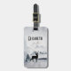 En bagagetagg med en vattenfärgsbild med en svart silhuettrut som står mellan vissa gräs träd. Grått Black and white neutralt färg.