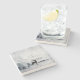 En sten underlägg med en vattenfärgsbild med en svart silhuettrenar som står mellan vissa gräs träd. Grått Black and white neutralt färg.