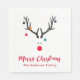 En rolig, söt, modern, minimalistisk bild av ett renhuvud med rött näsa. Med julprydnader, baublar hänger från småborna. Färg, Färger: vit, röd, grått, blå, grönt. Ett rött modernt handskrivet stil-skript med texten: God jul. Mall för din familj namn eller text.