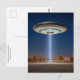 Un vaisseau spatial en forme de soucoupe volante planant au-dessus d'une installation militaire clôturée qui est supposée être la zone 51 ou area 51. Un puissant rayon lumineux descend du centre de l'OVNI vers l'entrée d'une zone restreinte, éclairant la nuit étoilée et l'espace désertique environnant.
