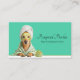 Ett enkelt affärskort med roligt som innehåller en hund inlindad i en handduk, med en mask från öga, med utsträckt redo från tassar som ska pamperas. Presenterad på tealbakgrunden till grönten. Det finns gott om utrymme för att lägga till din affärsinformation som du vill.
