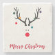 En rolig, söt, modern, minimalistisk bild av ett renhuvud med rött näsa. Med julprydnader, baublar hänger från småborna. Färg, Färger: vit, röd, grått, blå, grönt. Ett handskript i stil och texten: God jul.
