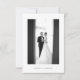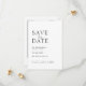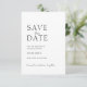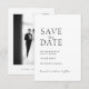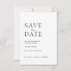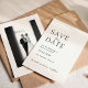 Den här inbjudan från bröllop spara datum har en ren och elegant minimalistisk utformning. Framsidan visar en modern blandning av serif och script typsnitt på en vit bakgrund med en enkel, balanserad layout. Baksidan markerar ett svartvitt par med blanksteg, där namn placeras underst i ett klassiskt serif-teckensnitt och skapar en tidslängd och ett förfinat utseende.