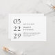 Modern bröllopsinbjudan med en ren och minimalistisk design med ditt datum i ett stort fet teckensnitt längs den lämnat sidan. Din information är i lämnat justering på högerna av ditt datum. Mallen innehåller en fält för ytterligare information på baksidan eller så kan du ta bort texten för att lämna den tom. Den minimala layouten behållor den här eleganten tillräckligt för ett formellt bröllop utan att vara för formell. Paletten färg är svart och vit och kan ändras till valfritt färger i designredigeringen av verktyg.