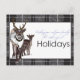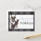 Den här charmiga julhälsningskortet har en handillustrerad ren och kalv som står tillsammans mot en ren vit bakgrund, inramad av en snygg svart-och-grå rutig kant. Elegant skrivstil och modern typografi förmedlar det hjärtliga budskapet "Önskar dig och din familj en magisk jul". Perfekt för att sprida vinterglädje, detta kort blandar rustik skogsvärme med modern design för en festlig, mysig känsla.