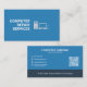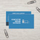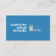 Ett blått affärskort för ett företag som reparerar datorer eller frilansaktiviteter som datortekniker, stöd för maskinvara och software, nätverksadministratör, underhåll, datorkonsult. Den är enkel och levereras med en illustration som inkluderar en dator, en bärbar dator och en mobil mobil. På baksidan finns det en QR-kod, kontaktinformation för fullt som är anpassad till ikoner och en lista över tjänster!