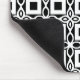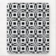 A repeating geometric pattern features black and white squares with interlocking oval shapes. The design is symmetrical, creating a visually striking contrast.