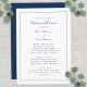 Klassisk design för middag före bröllop med elegant skrivstil i romantisk marinblå på en krispig vit bakgrund. Baksidan av inbjudan matchar och är enfärgat blå. Texten är lämplig för ett traditionellt och formellt kyrkbröllop. Använd den enkla moderna mallen för att ersätta exempelt texten med dina detaljer. Begäran om anpassad färg accepteras. Kontakta mig på invitationsuites@gmail.com eller använd meddelandelänken i denna lista om du har frågor eller behöver hjälp med denna eller någon av våra designer.