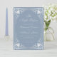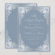 Denna eleganta, dammiga blå silver provsmakningsmiddagsinbjudan med vintage-känsla har en utsmyckad falsk silverfolierad ram med eleganta barockdekorationer på en dammig blå bakgrund. titeln, tillfället och namnet är skrivna med elegant kalligrafi. all text kan anpassas och har en silvergrå färg lik den falska silverramen.