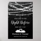 Repetitionsmiddags välkommen till kvällen före skylt - denna design har strängar av lampor och stjärnor på en svart strukturerad bakgrund. Och längst ner - Två svanar som formar en hjärtform.