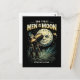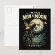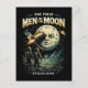 Två modiga astronauter blickar ut över ett månlandskap medan en fantasifull raket störtar mot en vaksam, personifierad måne.