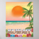Kuststrand Travel-affisch av en hett som sätter mitten östra sol i öknen på kvällen, det finns en lång vacker träd i handflatan i förgrunden.