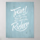 Resor är det enda sak du köper som gör dig rikare. Anonymt citat. Blå, rustisk träbakgrund med vit hand plockade stil (lätt text som visar struktur i texten).