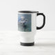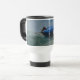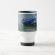 En resemugg med lock som behållor hetten att dricka varm och stoppa spill. Bekvämt för dem som är på flykt. Ett kusttema med en liten båt i havet dekorerar mugg.