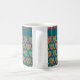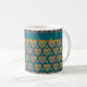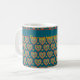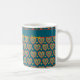 En anpassade Resemugg, med mönster med lite rött och grönt på mörkens tealbakgrund.