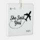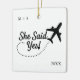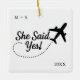 Fira kärlek på nya höjder med detta resetematiserade julgrynsförhäng för förlovade! På framsidan stavas "Hon sa ja!" ut med ett fantasifullt flygplansspår med möjlighet att anpassa detaljerna med parets initialer och år. Vänd på den för att anpassa den ännu mer, ladda upp din egen bild och ändra standardtexten "Förlovad - Äventyr väntar!", parets namn och datum för bröllopet.