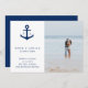 Nautisk fotospanska sparar datumet med lodrät bild på högerna. På den lämnat sidan finns ett marinblått ankare med monogrammet på vardera sidan, över en vit bakgrund. Baksidan är en passande skugga av marinblått. Det här är perfekt för ett badbröllop på sommaren.