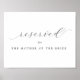 Ett minimalistiskt bröllop-tecken med "reserverat" i ett svart calligraphy-skript och "budens mamma" i serifteckensnitt.