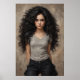 An intimate portrait of a confident young woman with dark curly hair and a gentle yet resilient gaze, radiating strength and individuality.