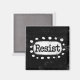 Fet text som läser "Resistent" centreras mot en svart bakgrund. Den svarta texten sitter på en vit rektangel med stora texturerade vita punkter runt den, vilket ger en lekfull kontrast mot den heltäckande bakgrunden i färg.