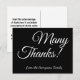 Den här respektabla, elegant-tack-du-vykortsdesignen innehåller meddelandet "Många tack!" på framsidan, tillsammans med ett anpassade på baksidan. Det skulle kunna användas för att visa uppskattning för någon som har deltagit i en bröllop, en begravning, ett studenten eller någon annan händelse.