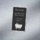 En anpassad restaurang magnetisk visitkortsmall med skripttext och en uppsättning bestick på en snygg broderad servett i grått på svart, med vita skriptbokstäver.