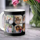 Snyggt fotot mugg i svart och grått med återfotokollage. Fotomallen är inställd för att du ska kunna lägga till 12 av dina favoritfoton, som automatiskt visas i blommans petalformer. Om du har problem med placeringen i bild kan du prova att beskära fotot till en kvadrat och ladda upp det på nytt. Om du vill redigera färgerna klickar du på "redigera med hjälp av designen verktyg" och du kan ändra bakgrunden till färg och det petala färgerna.