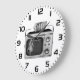 Keep time with a touch of mid-century elegance using this unique retro television wall clock. The clock face features a surrealist 1950s portable tv graphic in a monochrome palette, turning a functional timepiece into a work of vintage art. Perfect for home offices, kitchens, or living rooms, this black and white clock complements mid-century modern decor and antique electronics collections. It serves as a sophisticated conversation piece that celebrates the timeless aesthetic of the silver screen era while helping you stay on schedule in style.