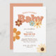 Den här gruppinbjudan innehåller ett 70-talets barnduschtema. Ord "Baby" är tryckt i ett stort bubbelteckensnitt och accentuerad med söta blommor från 1970-talet stil. En större blomma placeras på den lämnat och en annan på grund-högerna.