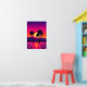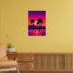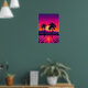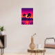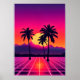 Ett 80-talets ångvågssolnedgång med neonnät, handflatan träd och en glödande horisont. Perfekt för nostalgiskt synthwave älskare.