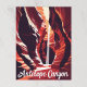 En resefärg från stil fångar Antelope Canyons häpnadsväckande, omulerande röda och orange sandstensväggar, med en ljusaxel som belyser den smala passagen och visar dess ikoniska skönhet.