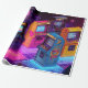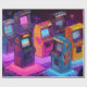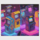 En grupp vintage maskiner är belyst av vibrant neon ljus. Scenen ställs mot en bakgrund av en stjärngalaxi som skapar en nostalgisk atmosfär i futuristiskan.