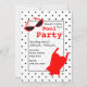 En bassäng-partikamrat med en vit bakgrund med små svarta polka dots på framsidan och baksidan. Solglasögon av röda katt öga i det övre lämnat hörnet och rödskinn en biet badande kostym i grund höger. Anpassa den svarta och röda texten över plustecknet med information om tillfälle.