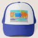 Kom in! Vatten är bra! Truckerkepsen Retro Bassäng Party har en levande, tecknad teckning av en roligt och ett sofistikerat bassäng party. Den moderna designen i mitten av århundradet centrerar sig kring ett runt simmande bassäng på ett stort, grått, betongband. Bassäng är fyllt med turkos vatten. Orangens murverk omger bassäng och det finns en vit, plank dyktavla allt redo för en äventyrlig själ. En röd och vit strand boll flyter i vatten. På motsatt sida om bassäng är det två party-goister som håller fötterna i vatten och vilar på röda och vita stranddukar. Kvinnan med svart hår bär en rosa baddräkt på en biet. Förutom henne är det en tropisk dryck i en kokosnöt med lite paraply och en grönt halm. Den blondande mannen har stora gröntar. Han sparkas med händer bakom huvudet. Till lämnad om bassäng är en framstående man med vita hår och simmor i jade som håller en drink i en kokokosburk snäcka. Vi vet att han är framstående för att han är en man med vitt hår! Han pratar med en kvinna med blondinskt hår och ett timglas figur med turkodräkt. Slung över hennes arm är en gult strandduk. Bakom den här scenen finns en grönt silhuett från handflatan träd och en futuristiska orange, ett tegelhus. Genom det stora, golv till takfönster, blå glasfönster, kan du se silhuetten av en TV, stol, ottoman och stjärnklocka. Himlar bakom huset är en molnlös turkos med en runda, gult sol.