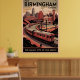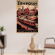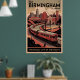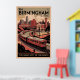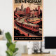 En vintage-inspirerad reseaffisch som illustrerar Birmingham, Alabama, som återges i ett stil som påminner om 1920-talets Art Deco poster. Scenen har en stiliserad bild av Birmingham-skylinen, inklusive ikonisk byggnad som Red Mountain Inn, med en lindrande väg mot stadskärnan. En vintage passagerare tåg, färgad i djupt rött och beige, på ett skonsamt sätt kurvor längs spåren i förgrunden och skapar en känsla av rörelse och äventyr. Poster innehåller ord "VISIT BIRMINGHAM" i ett klassiskt serif-teckensnitt högst upp, medan en mindre bildtext vid grund står "Sydliga magiska staden" i ett liknande stil, som alla ställs in mot bakgrund av muterade sepiatoner och subtle Moln mönster.